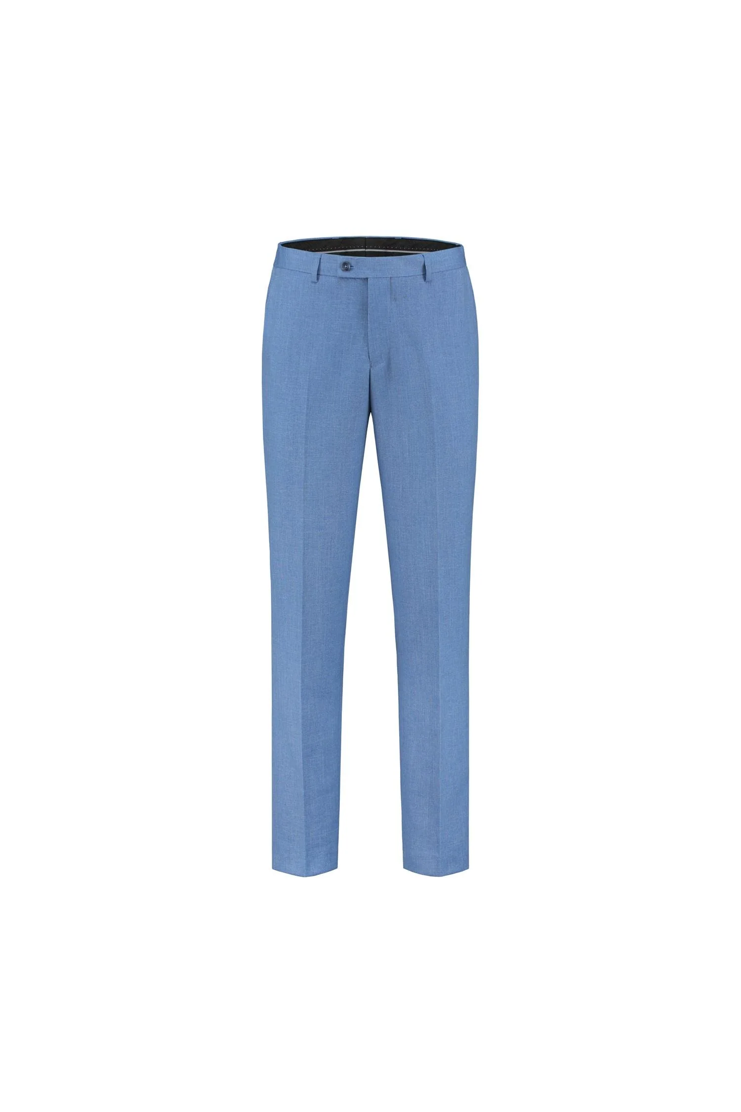 Staalblauwe pantalon met kreukvrije stretch, knoop en ritssluiting.
